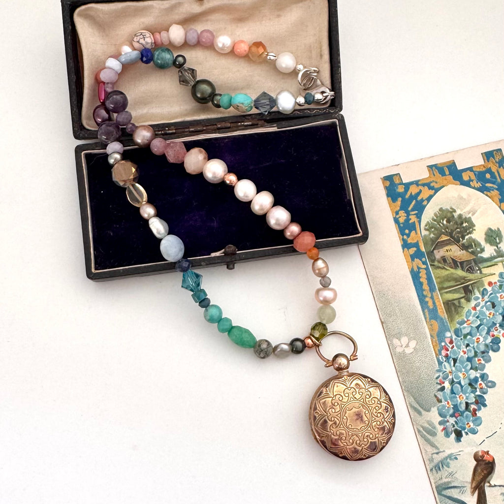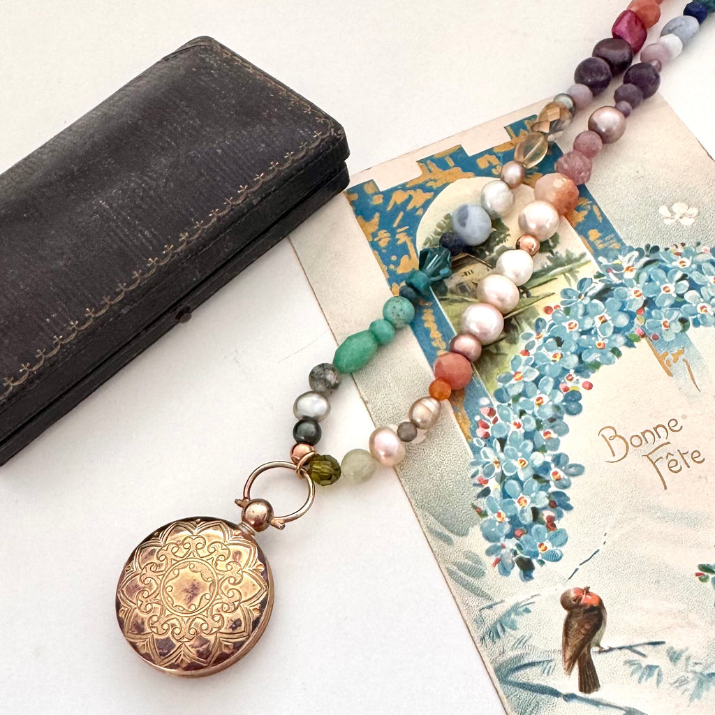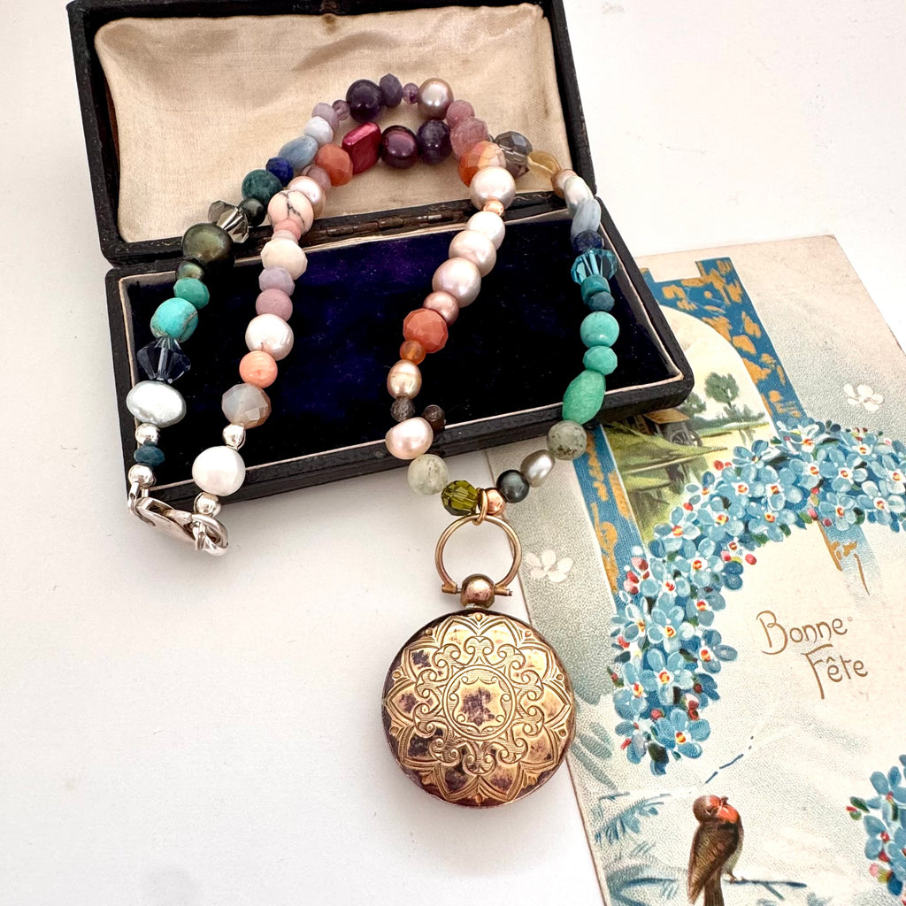 SOLD Vintage Gilt Locket Pearl And Gemstone Necklace