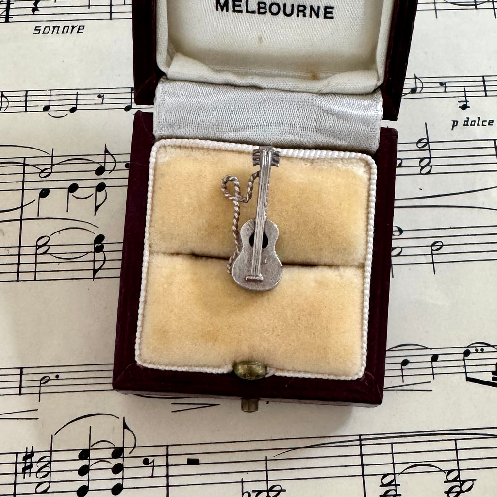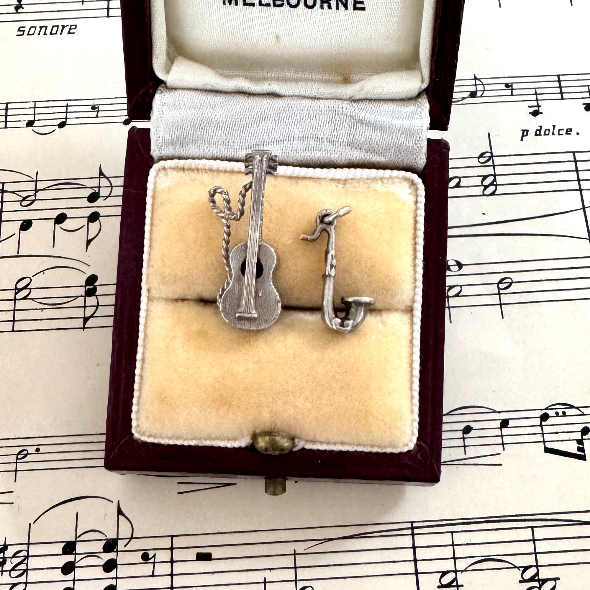 Vintage silver musical instrument charms, a guitar and saxophone. Perfect for the music lover in your life.
