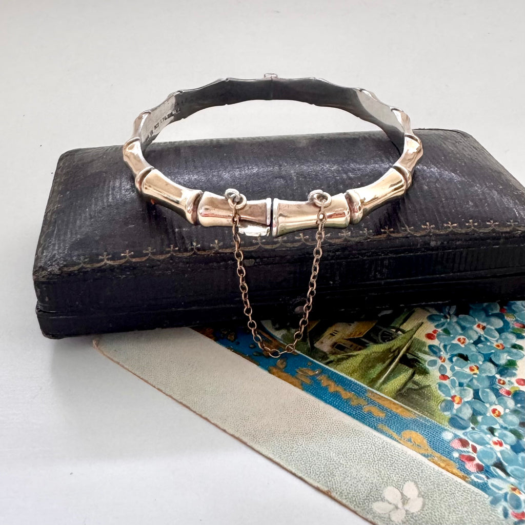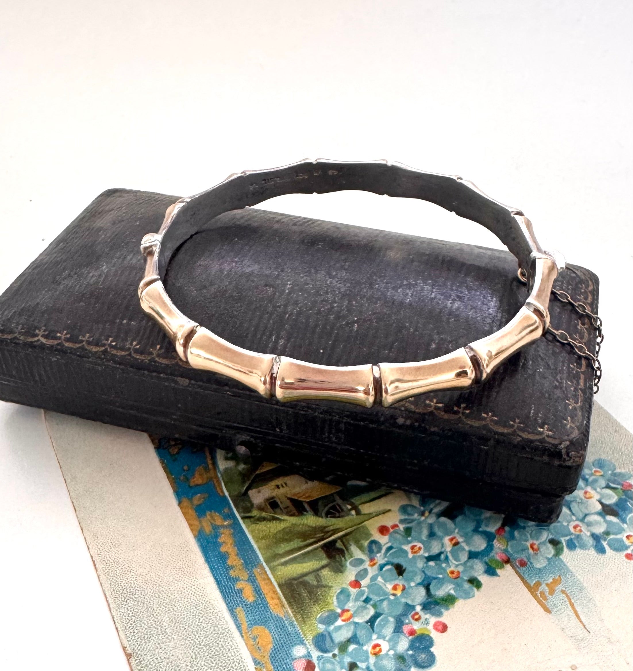 Gorgeous rare 9ct rolled gold on sterling silver hinged bamboo bangle with safety chain.