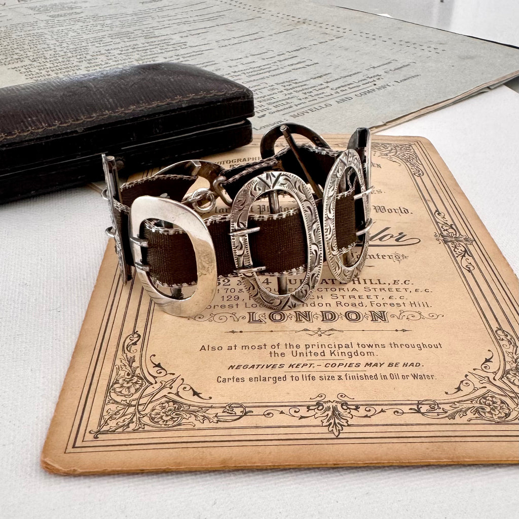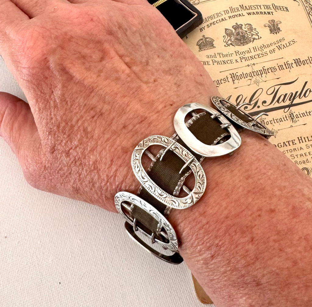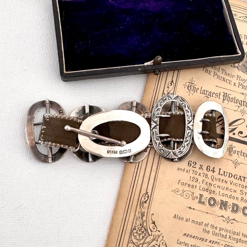 Incredible heavy grosgrain ribbon bracelet created from antique sterling silver buckles and with a t bar closure. The buckles are all in excellent antique condition with beautiful detailing and engraving. They are all hallmarked as follows
