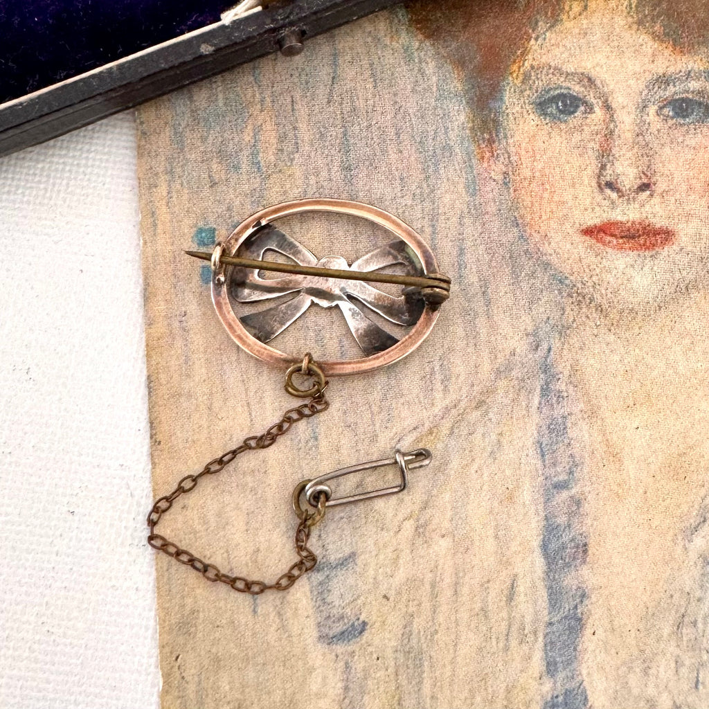 Pretty antique silver bow brooch with gold lined frame and original safety chain.