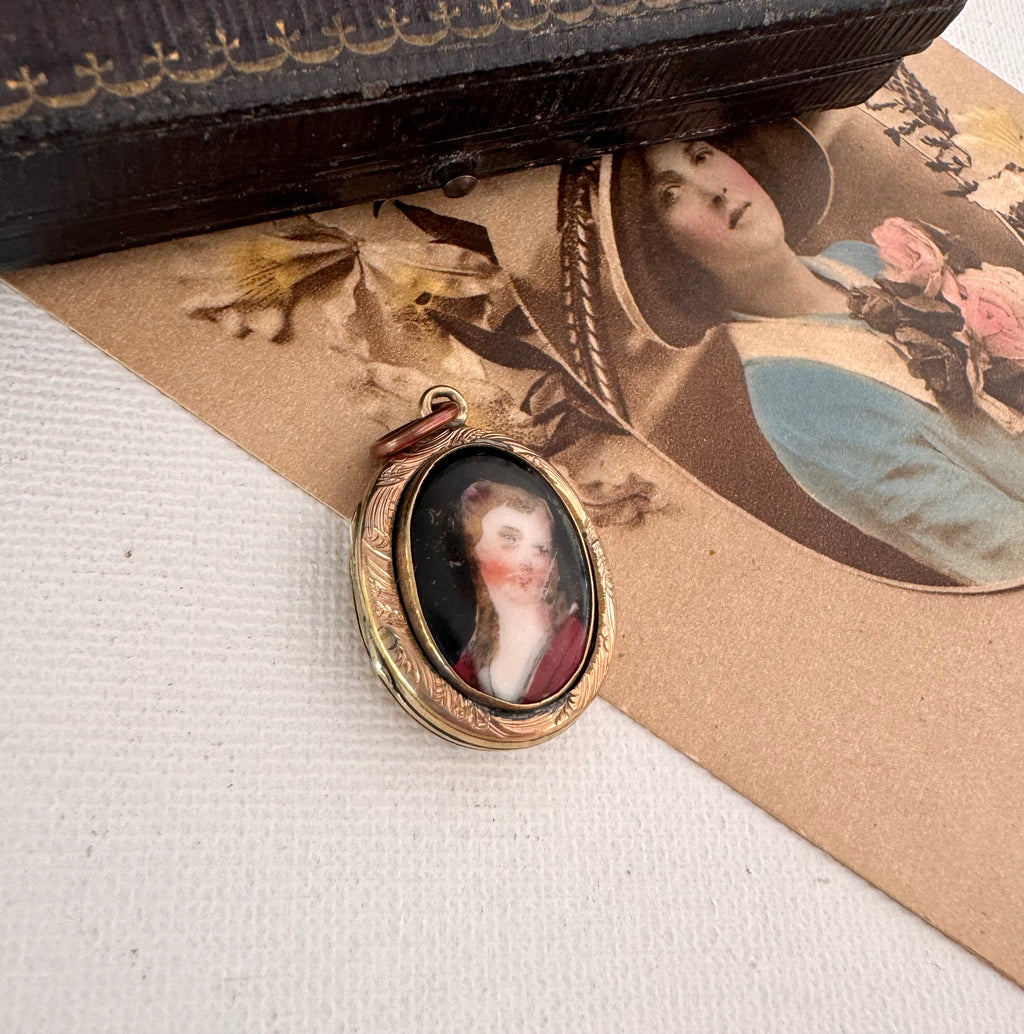 Pretty antique rolled gold locket with hand painted porcelain portrait of a young woman on one side and floral engraving on the back.