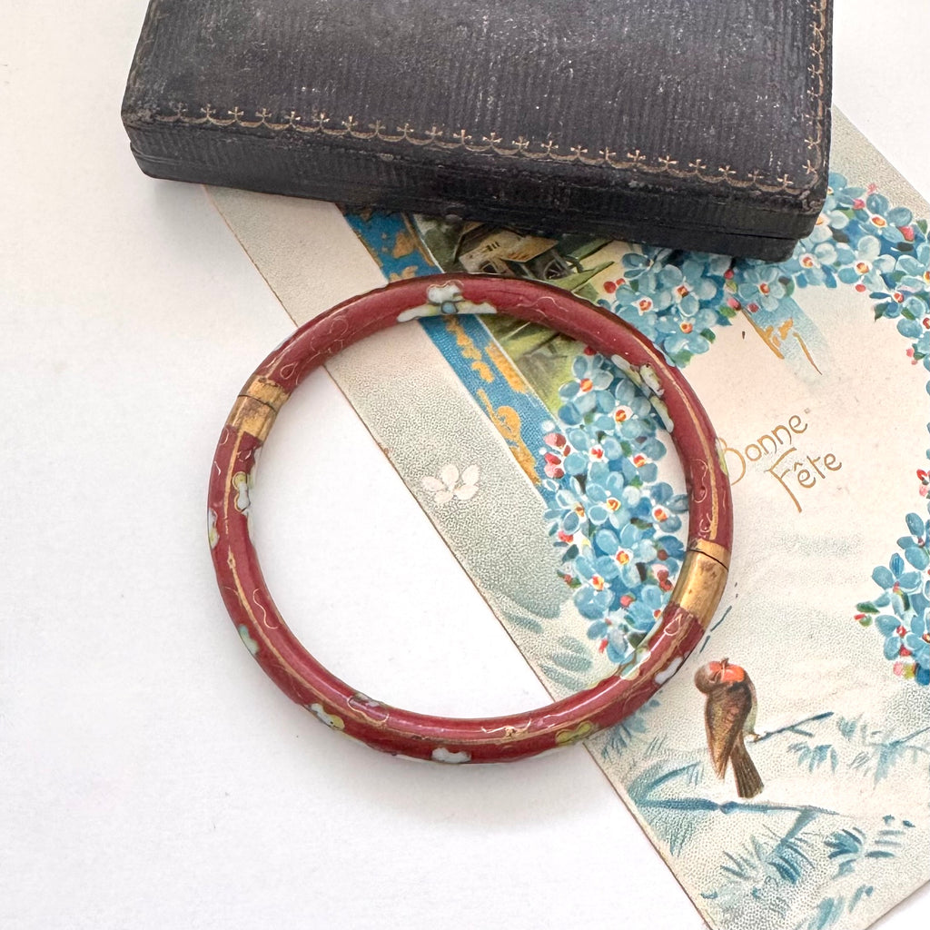 Gorgeous vintage hinged cloisonne bangle. The hinges functions smoothly and is in good overall condition.