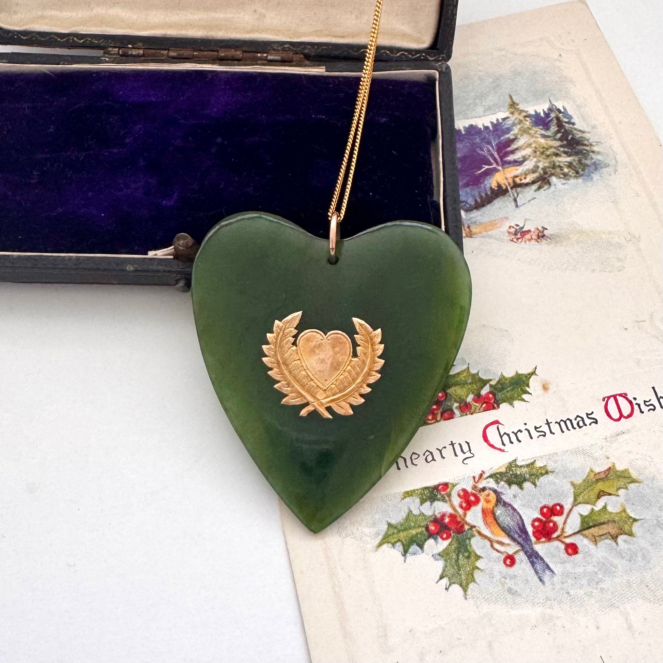 Vintage Large Greenstone 9ct Gold Heart Pendant Necklace