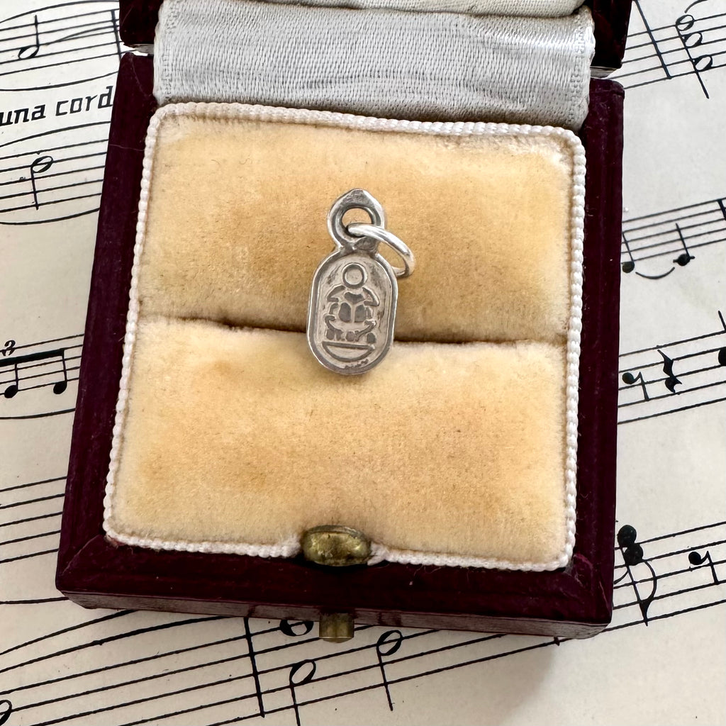 Vintage silver Egyptian themed souvenir charms, a scarab beetle and sphinx.